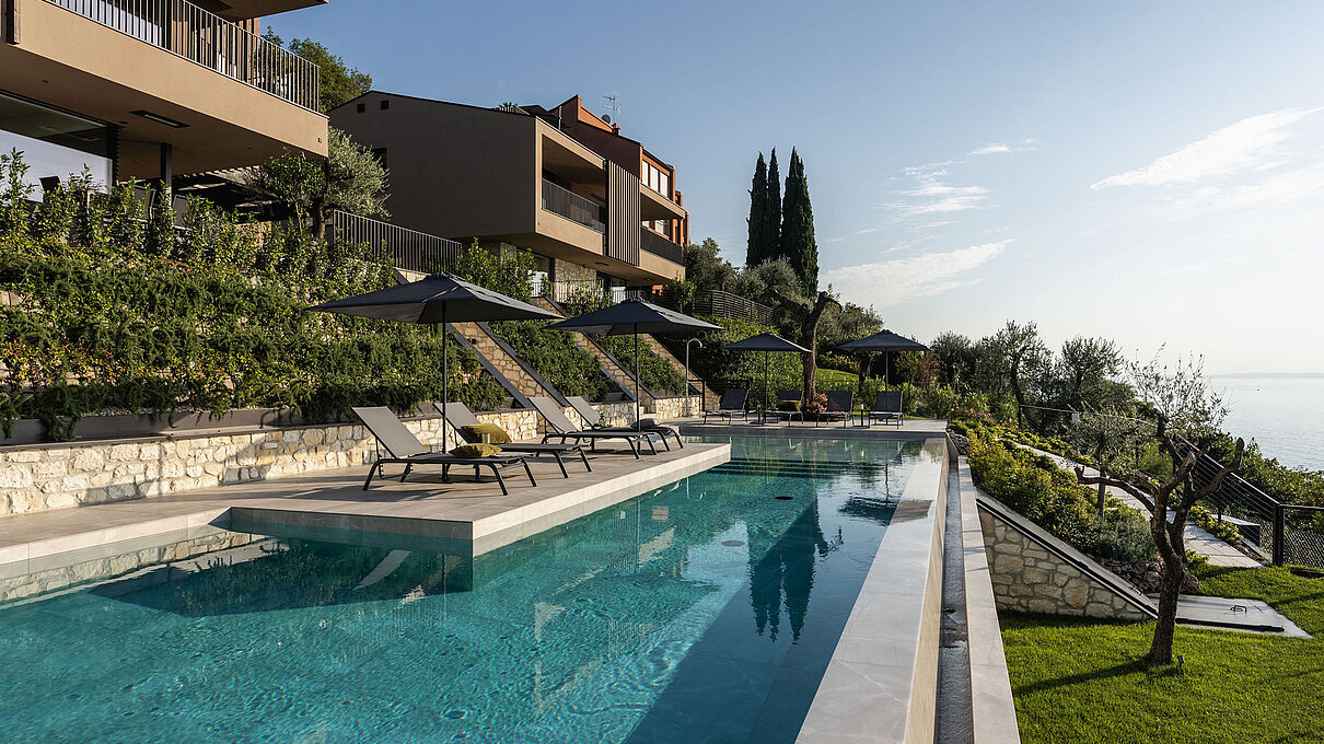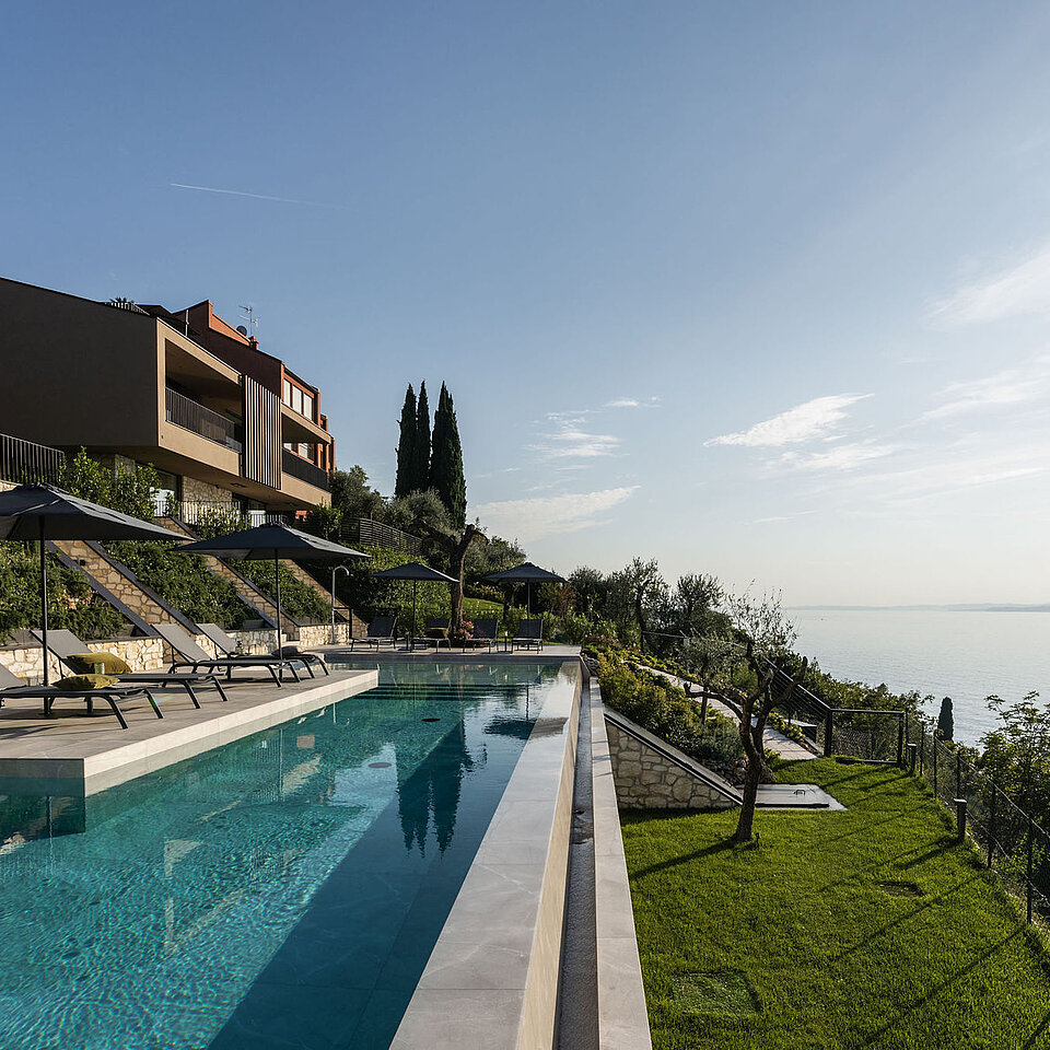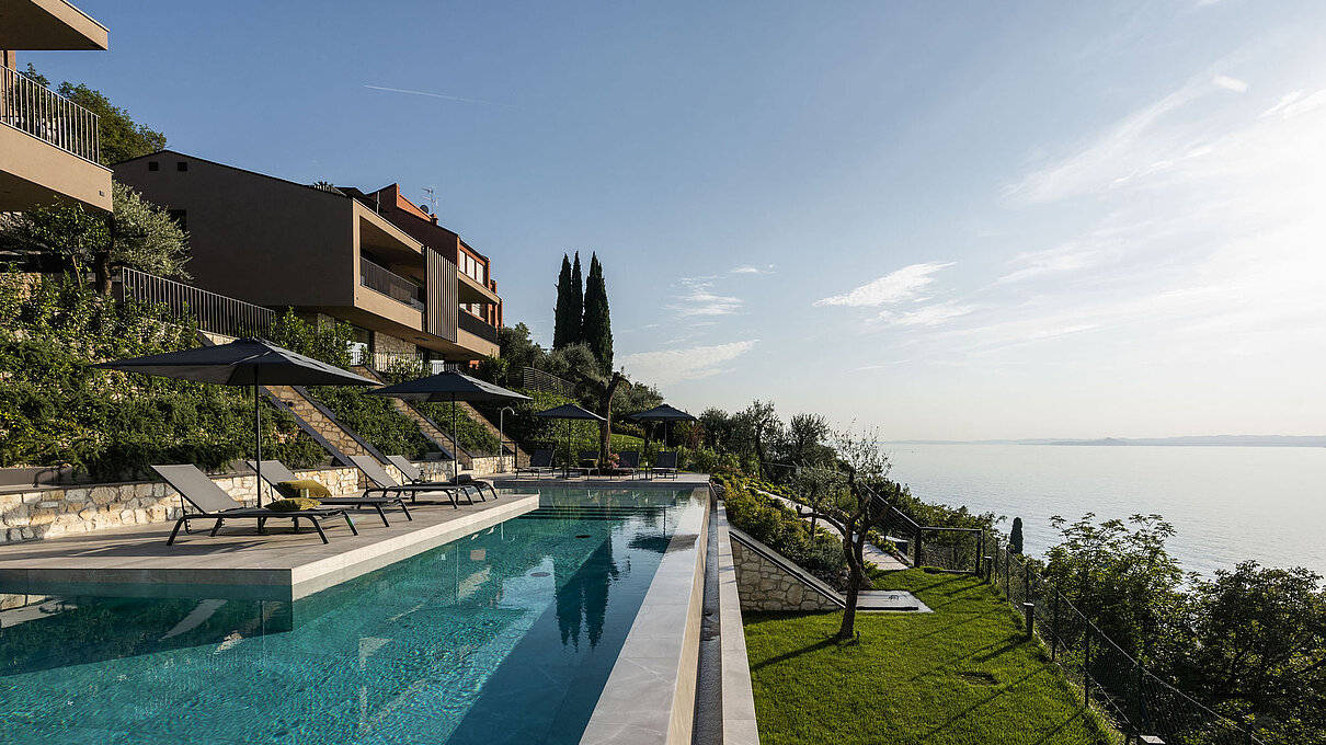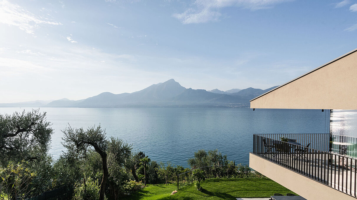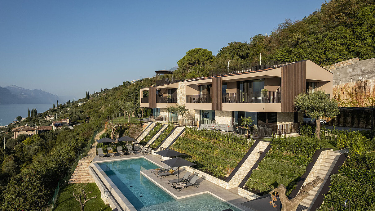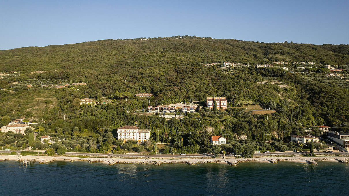Entlang des Sees, etwas oberhalb von Torri del Benaco, am Hang der Gardesana, erstrecken sich drei elegante Baukörper bestehend aus sechs Einheiten. Der atemberaubende Ausblick auf das Hafenstädtchen und die Weiten des Sees machen den Aufenthalt zu einem Erlebnis der besonderen Art.
