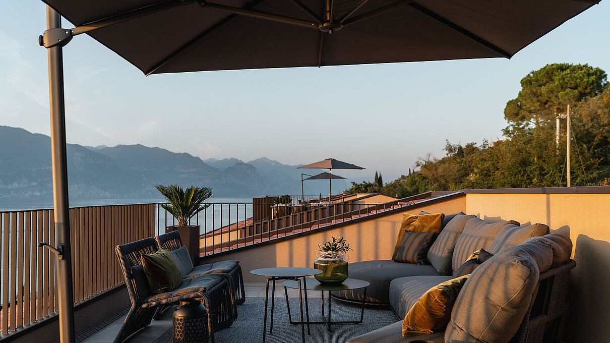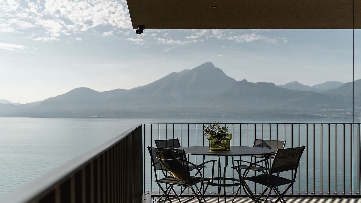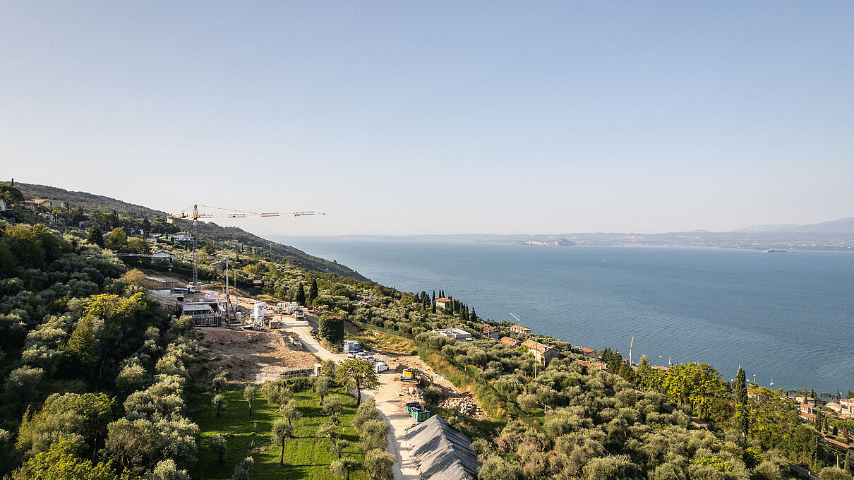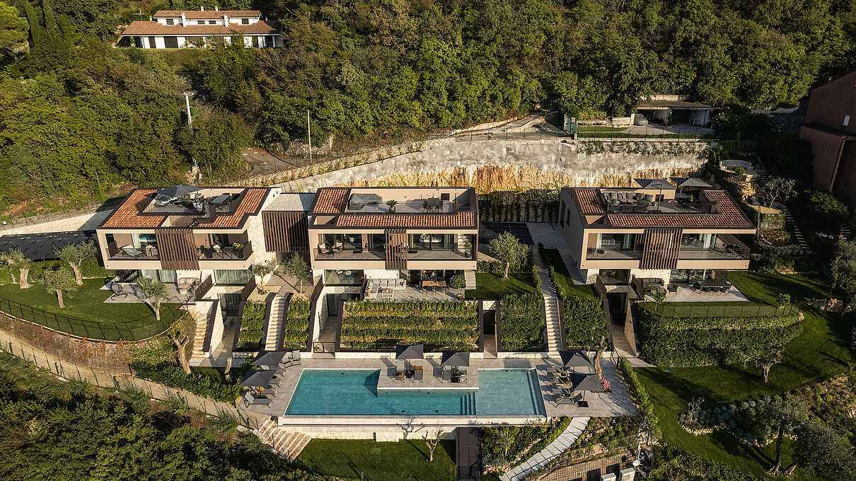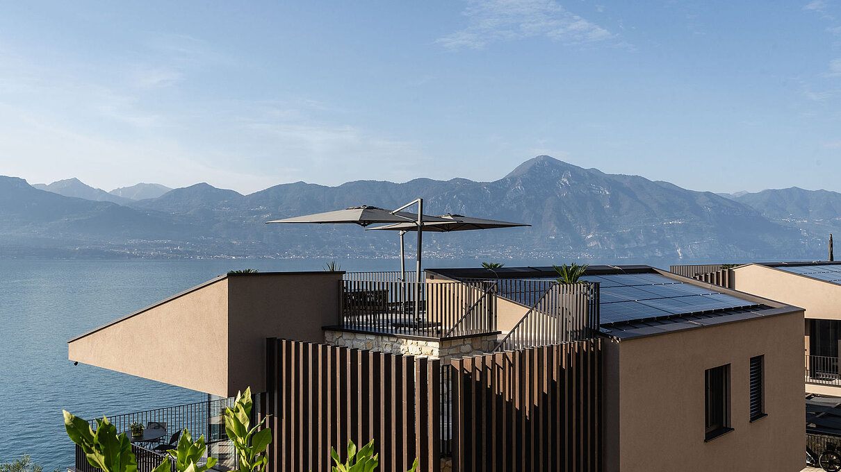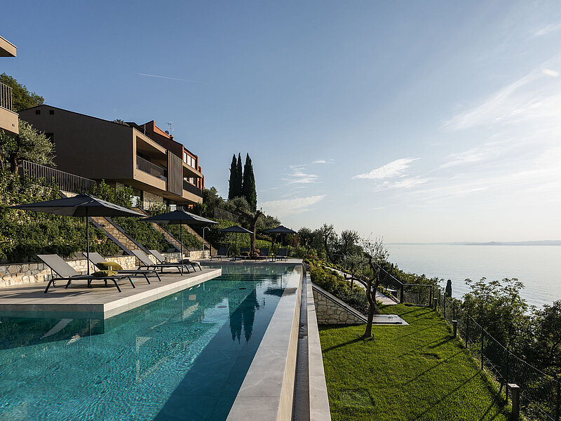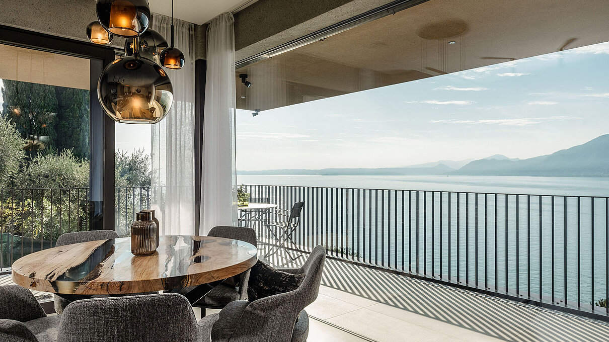 Entlang des Sees, etwas oberhalb von Torri del Benaco, am Hang der Gardesana, erstrecken sich drei elegante Baukörper bestehend aus sechs Einheiten. Der atemberaubende Ausblick auf das Hafenstädtchen und die Weiten des Sees machen den Aufenthalt zu einem Erlebnis der besonderen Art.