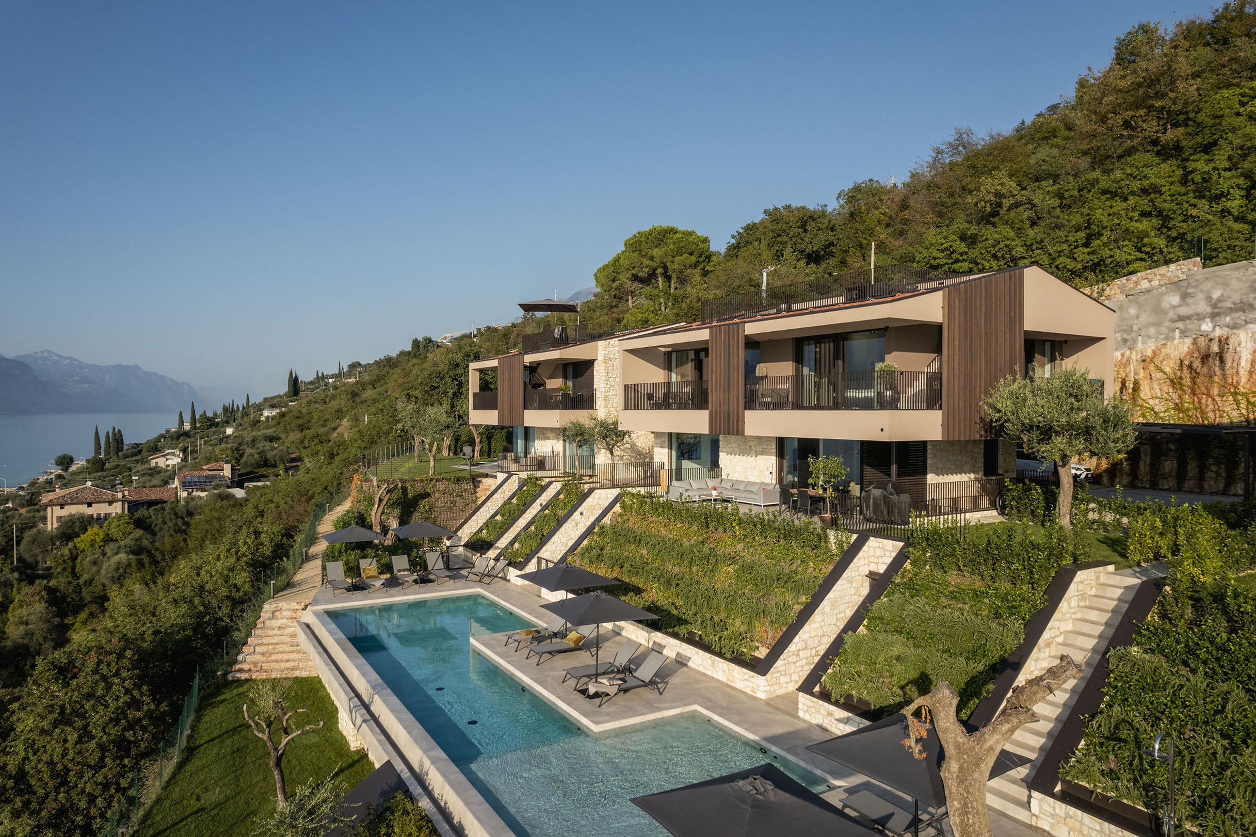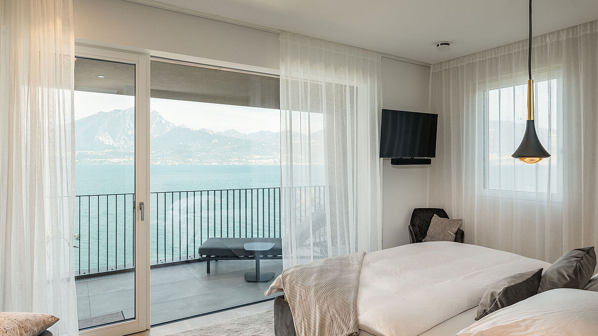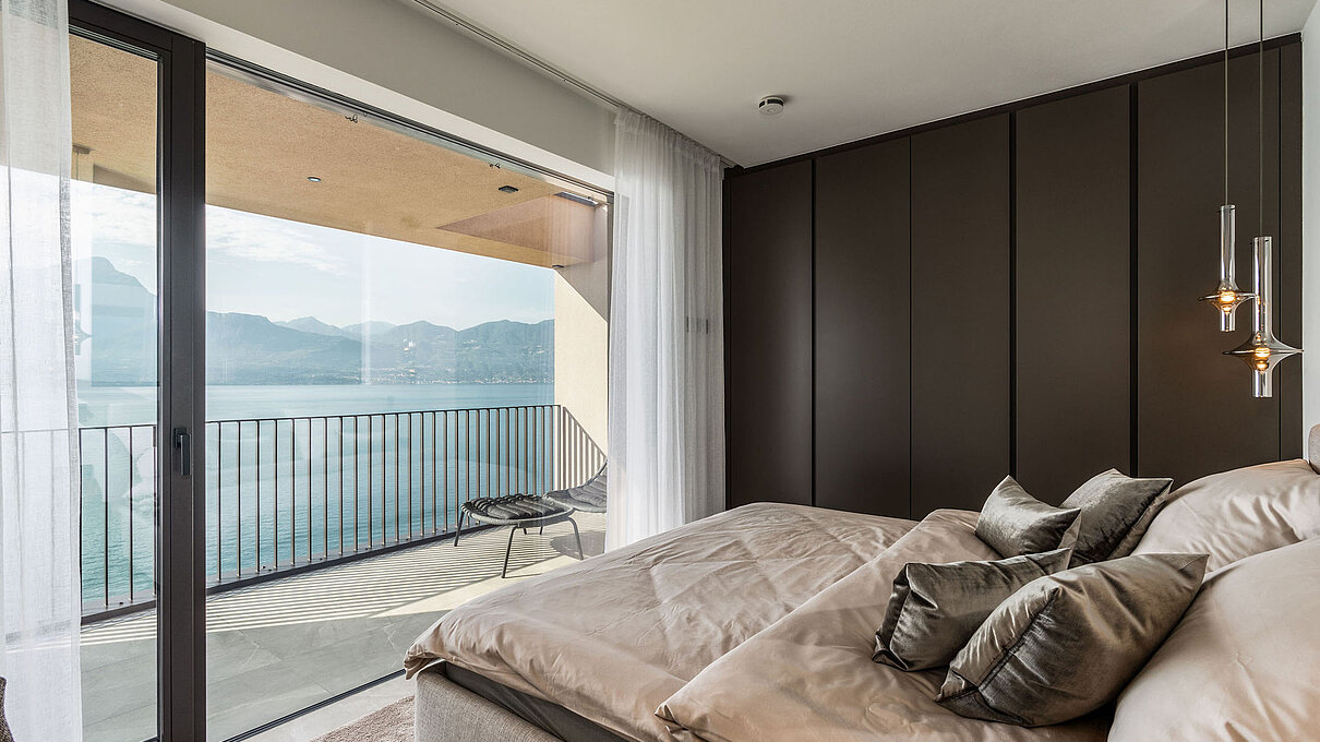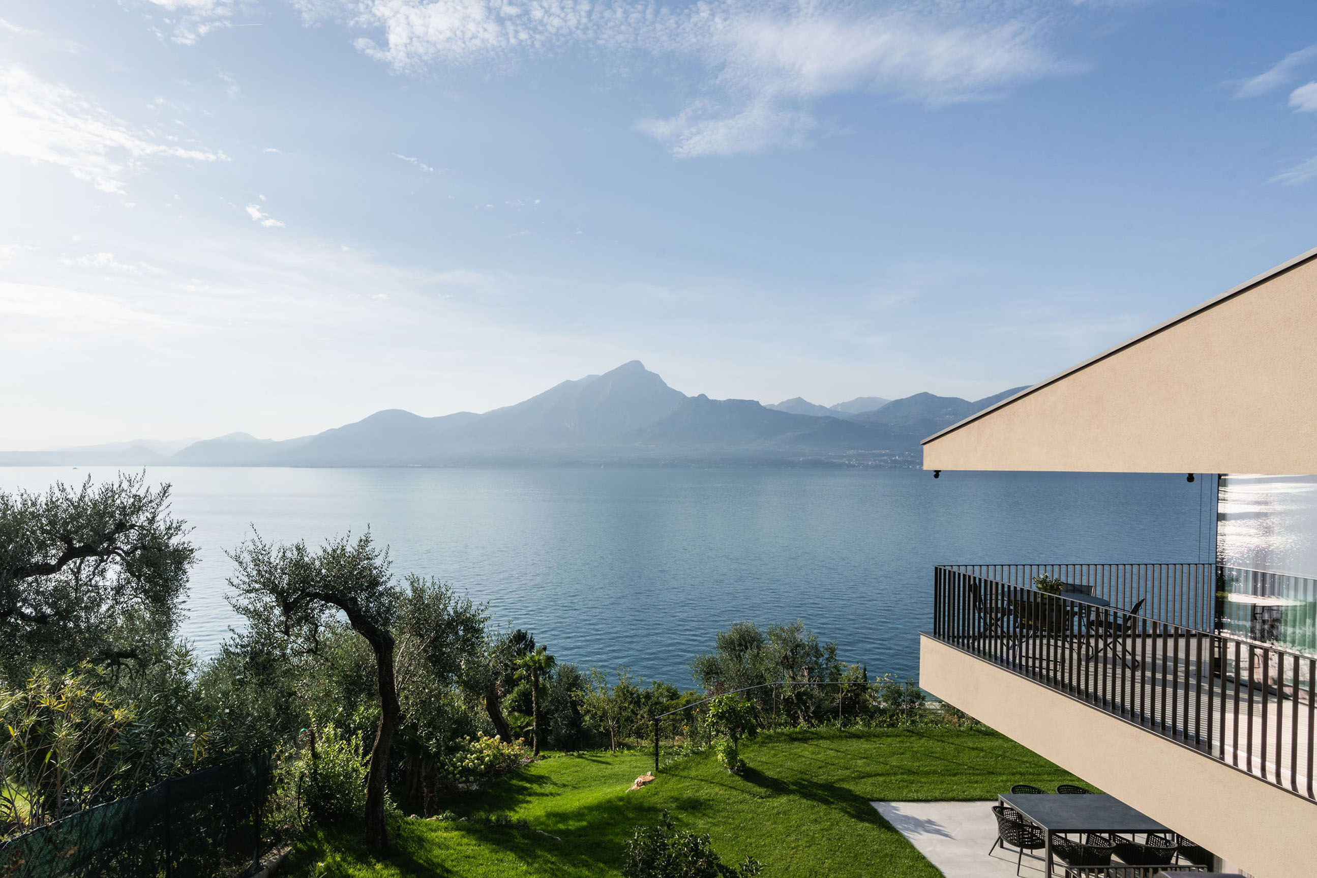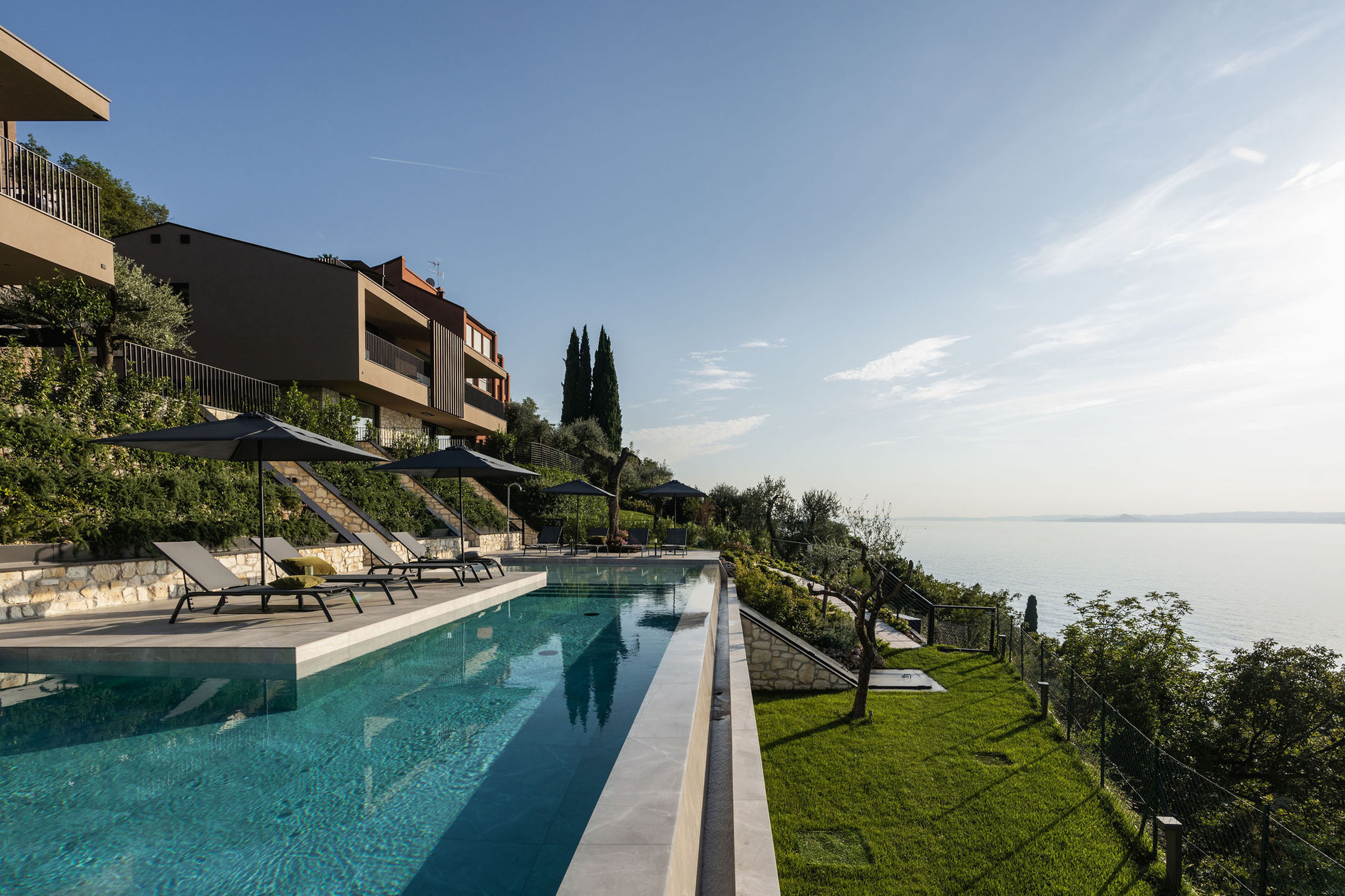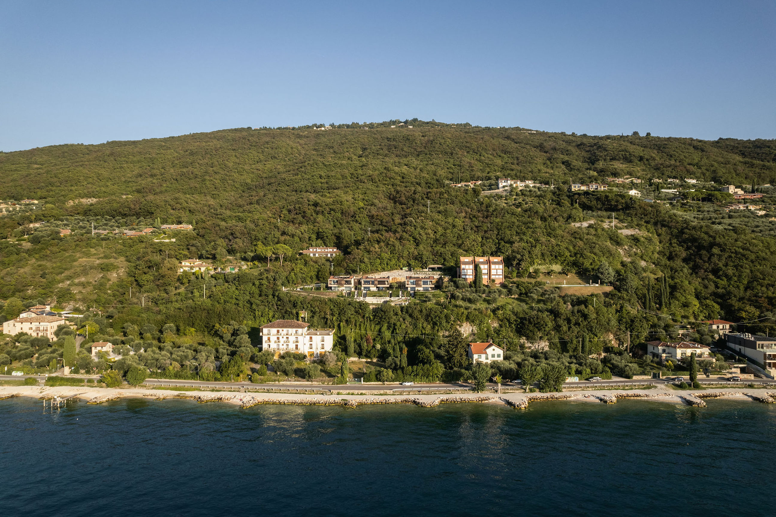 Entlang des Sees, etwas oberhalb von Torri del Benaco, am Hang der Gardesana, erstrecken sich drei elegante Baukörper bestehend aus sechs Einheiten. Der atemberaubende Ausblick auf das Hafenstädtchen und die Weiten des Sees machen den Aufenthalt zu einem Erlebnis der besonderen Art.