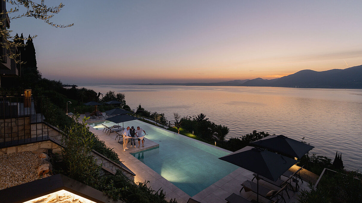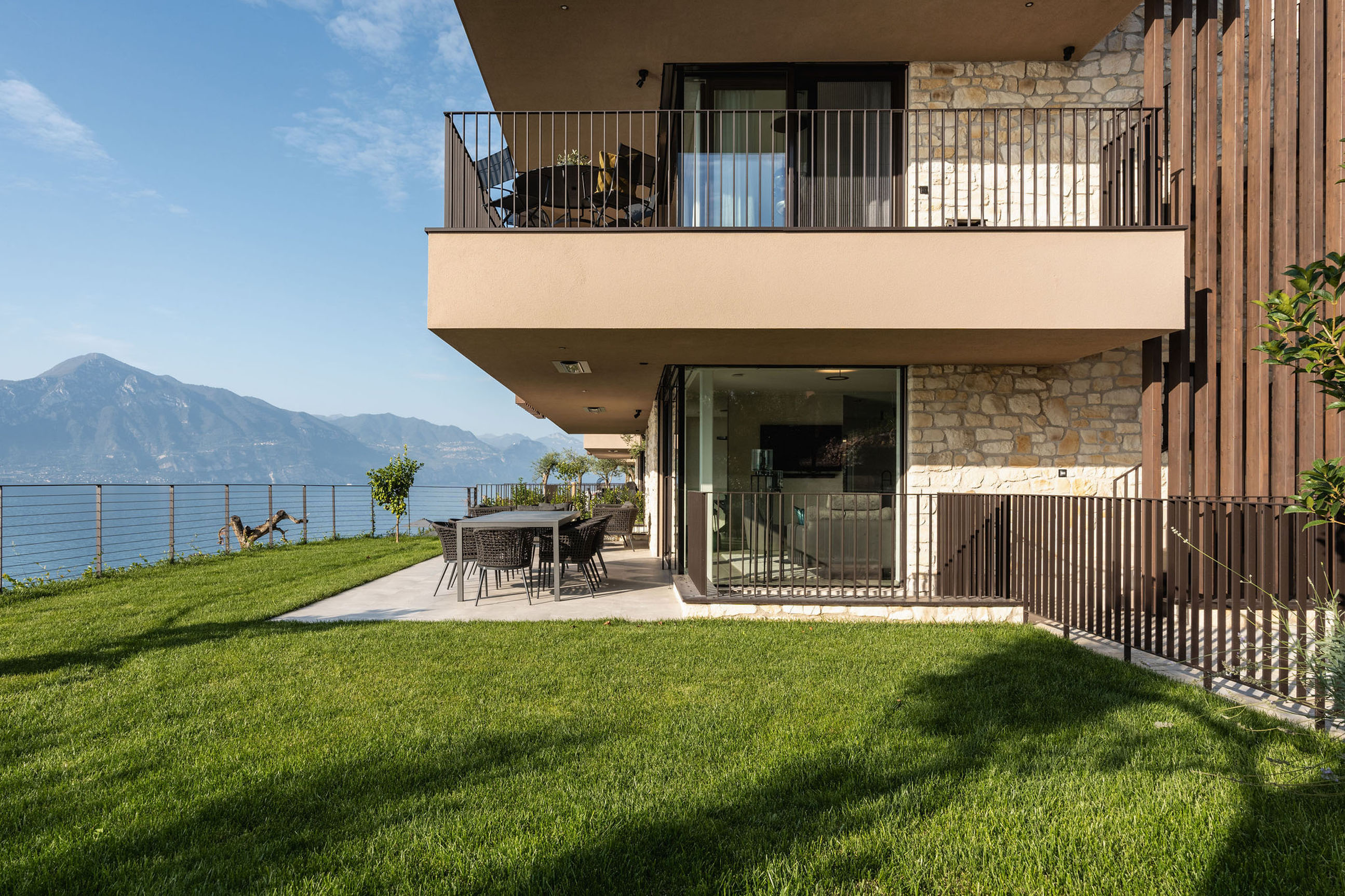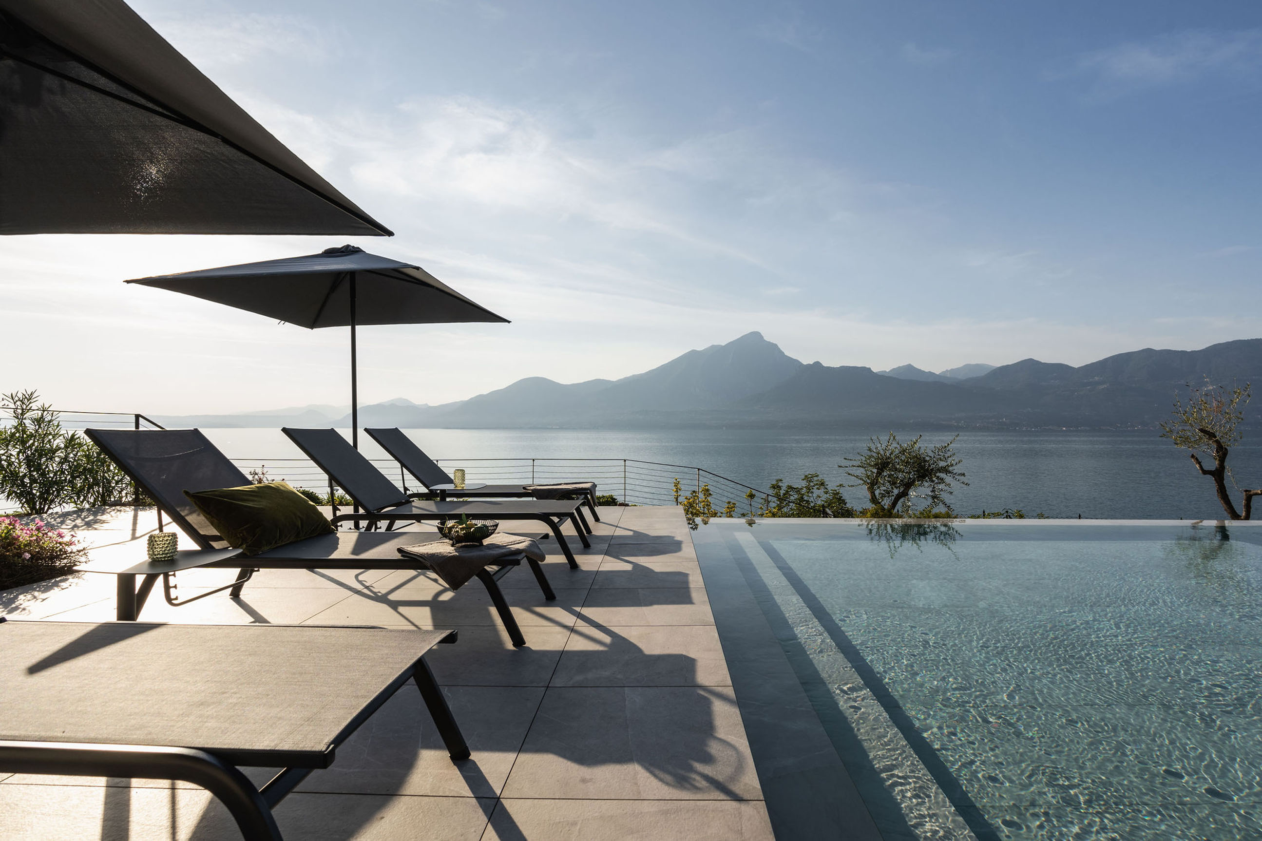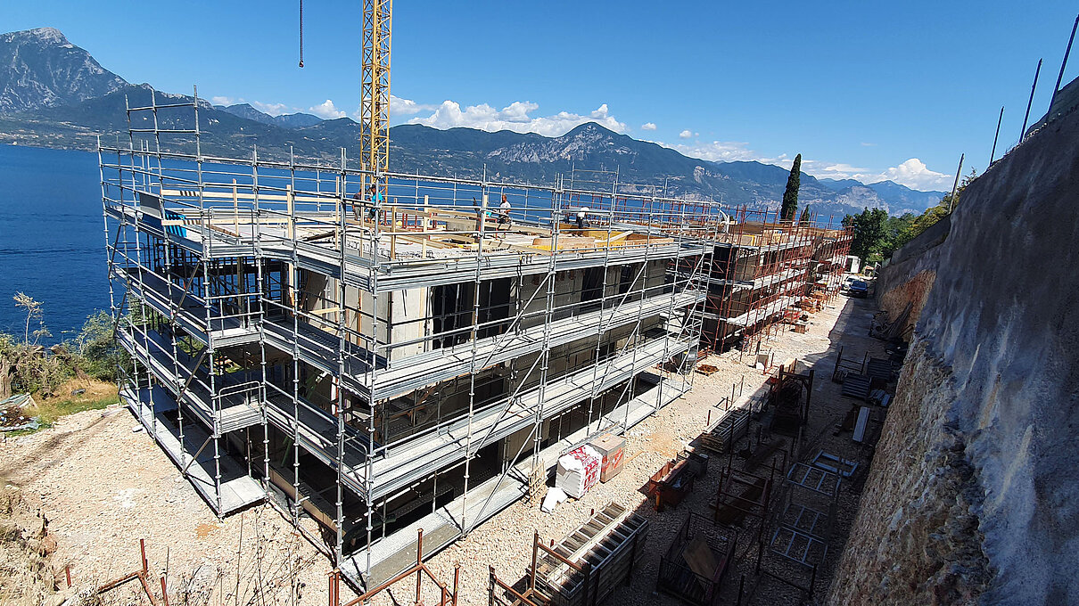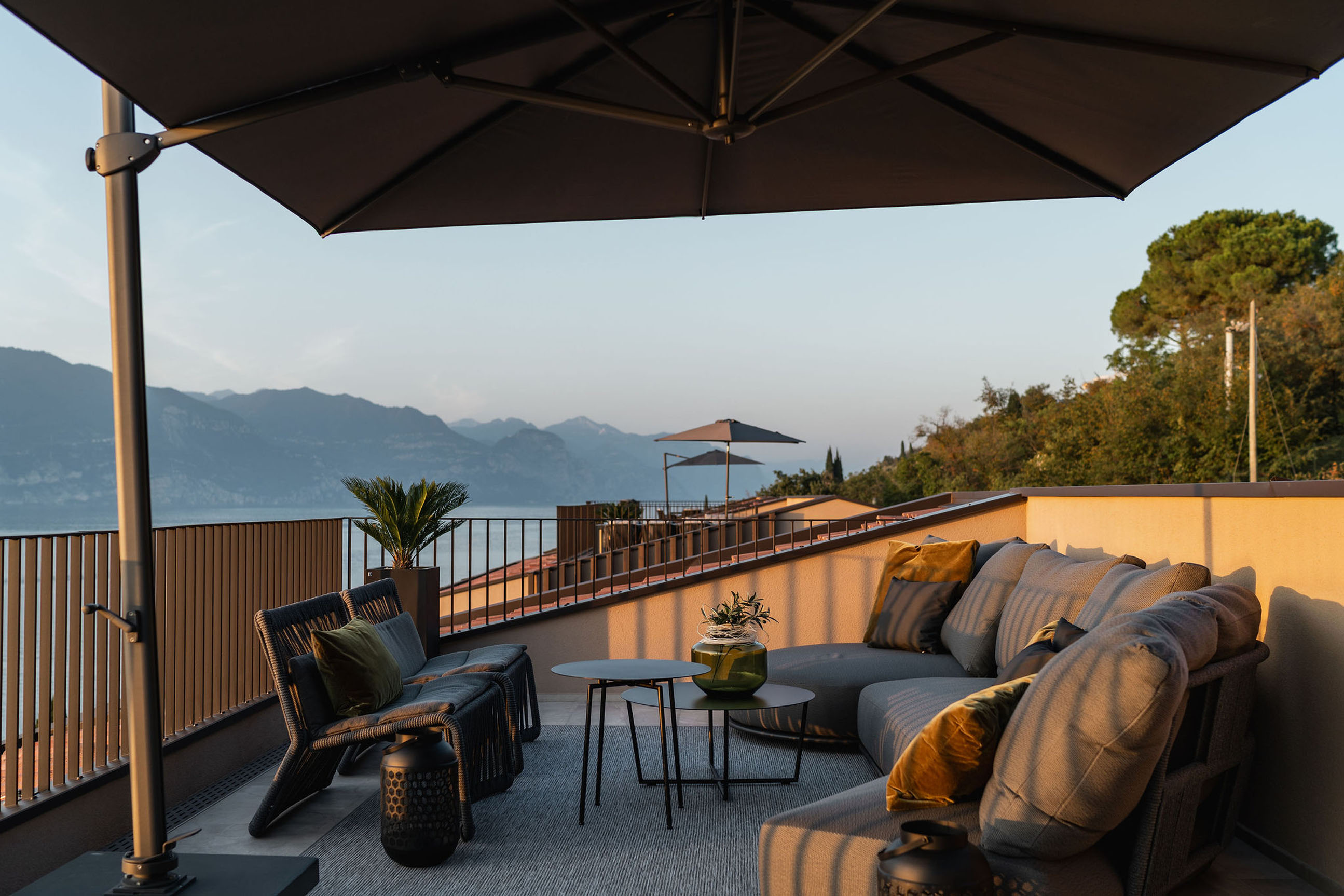 Entlang des Sees, etwas oberhalb von Torri del Benaco, am Hang der Gardesana, erstrecken sich drei elegante Baukörper bestehend aus sechs Einheiten. Der atemberaubende Ausblick auf das Hafenstädtchen und die Weiten des Sees machen den Aufenthalt zu einem Erlebnis der besonderen Art.