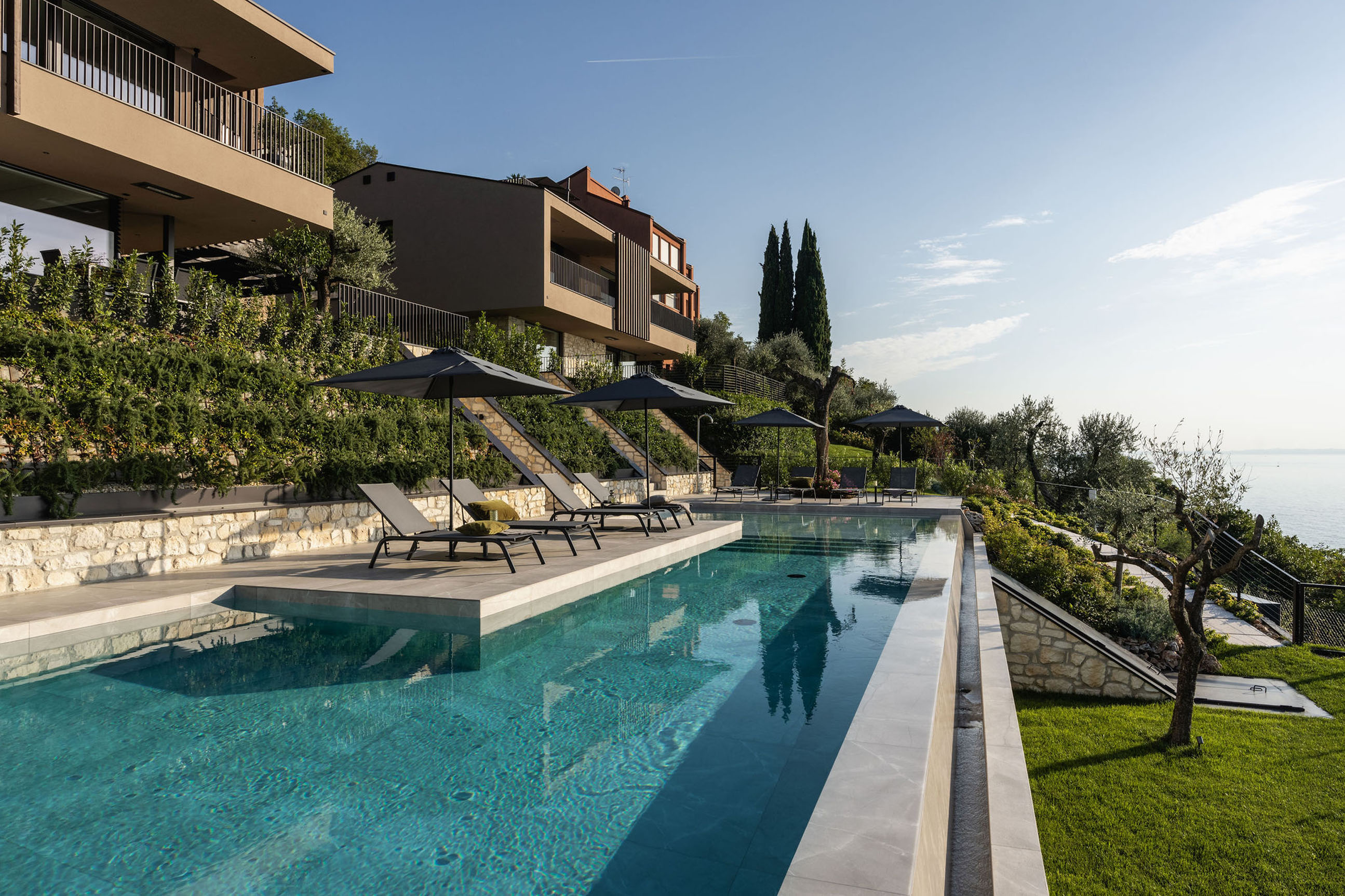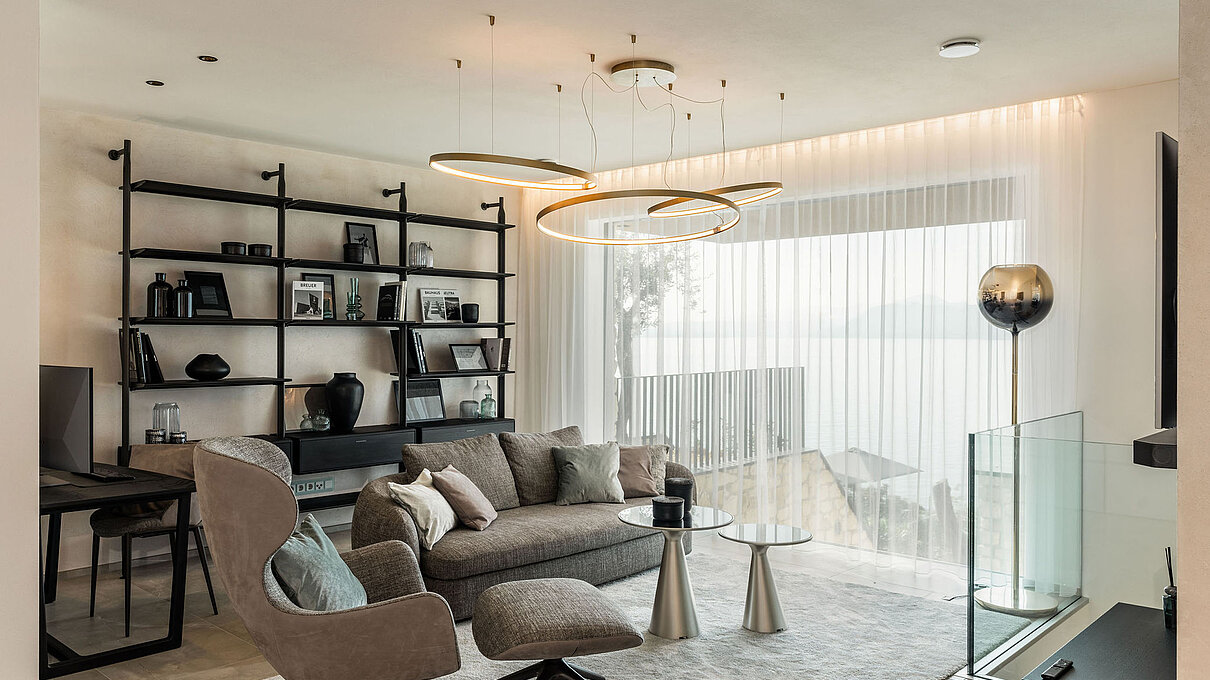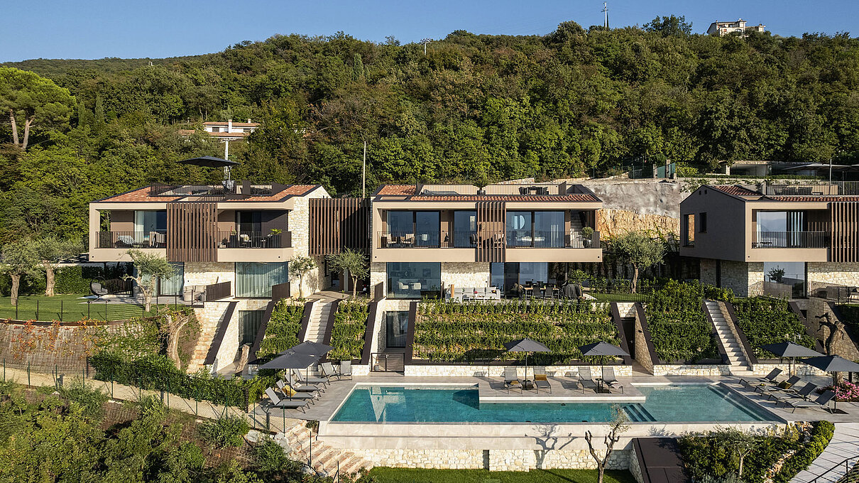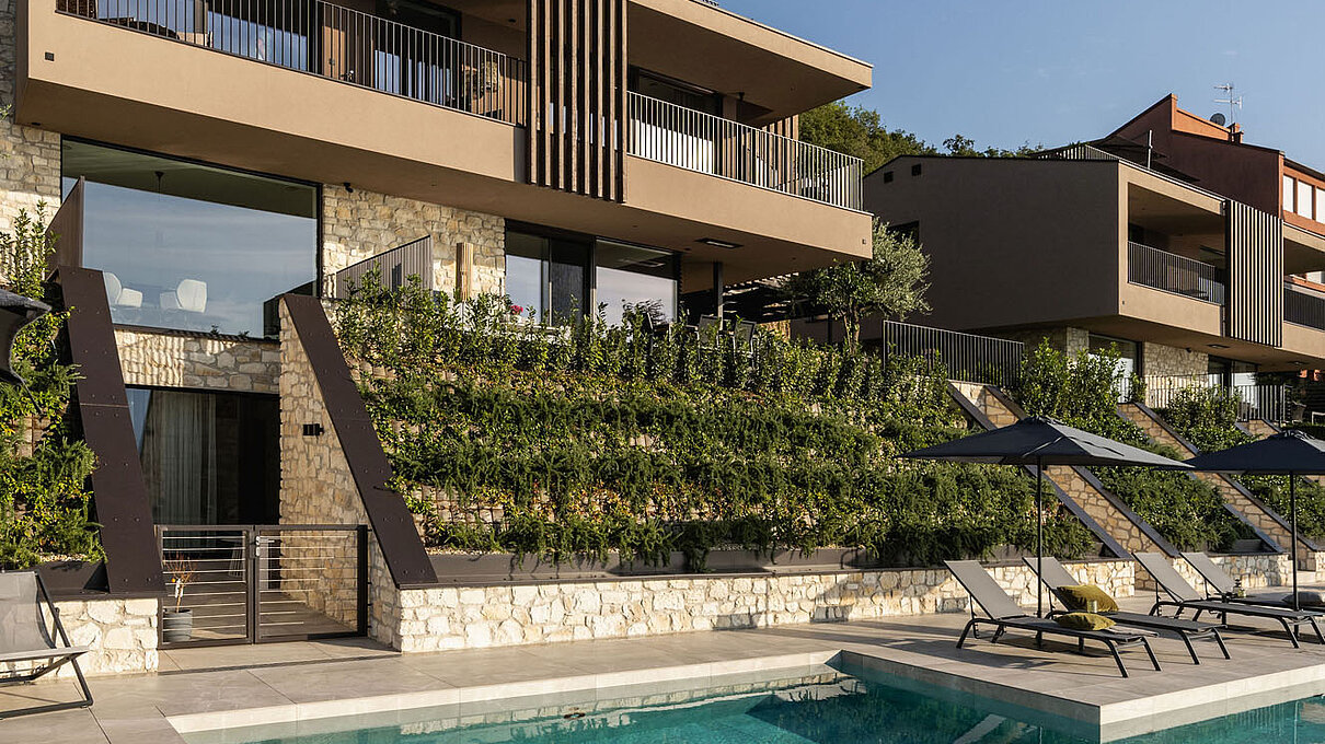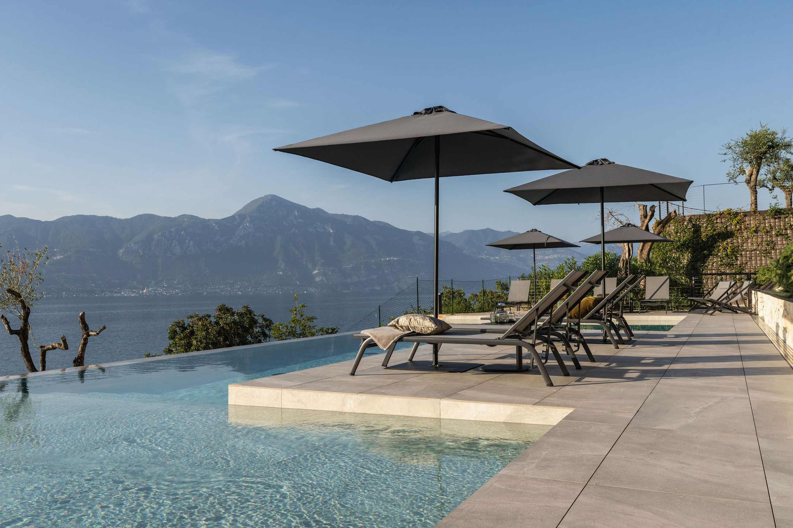 Entlang des Sees, etwas oberhalb von Torri del Benaco, am Hang der Gardesana, erstrecken sich drei elegante Baukörper bestehend aus sechs Einheiten. Der atemberaubende Ausblick auf das Hafenstädtchen und die Weiten des Sees machen den Aufenthalt zu einem Erlebnis der besonderen Art.
