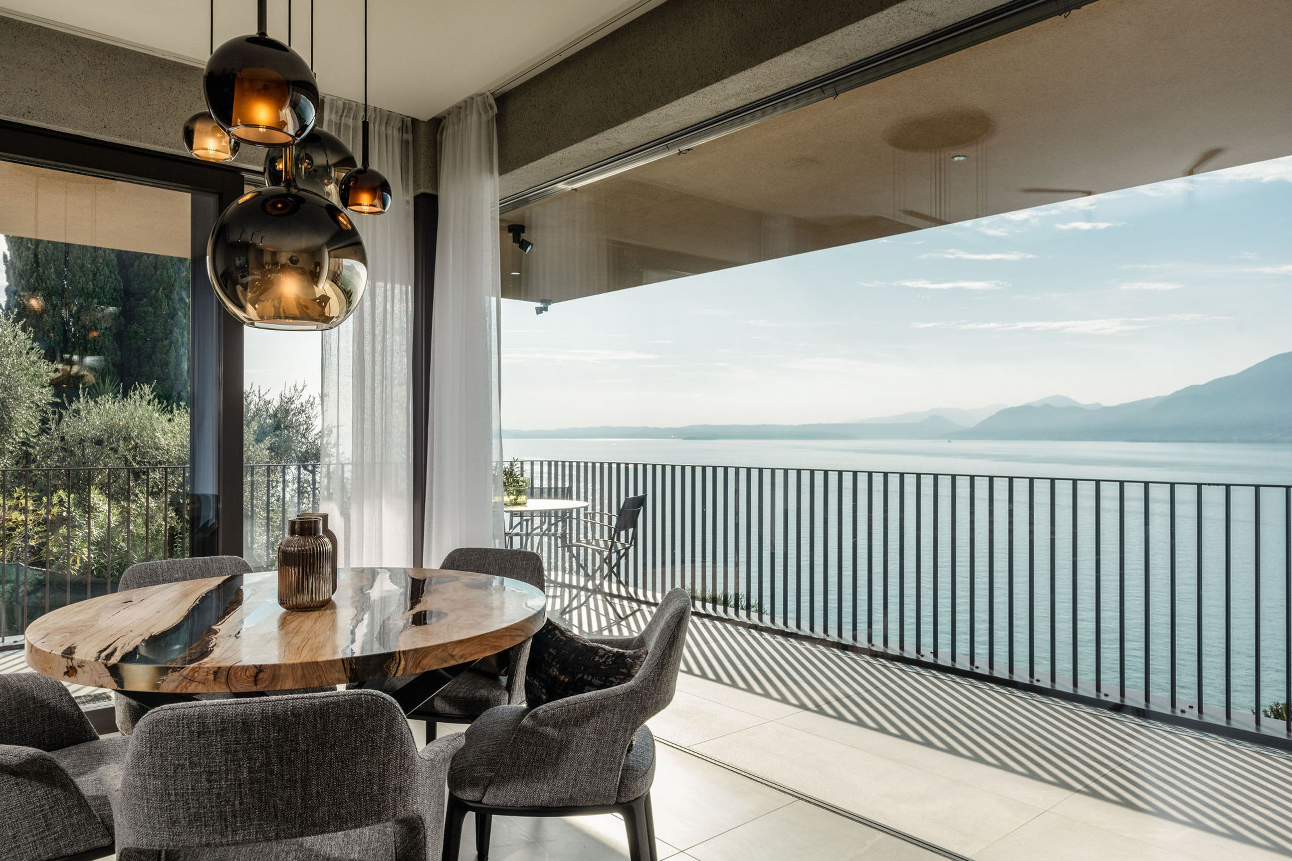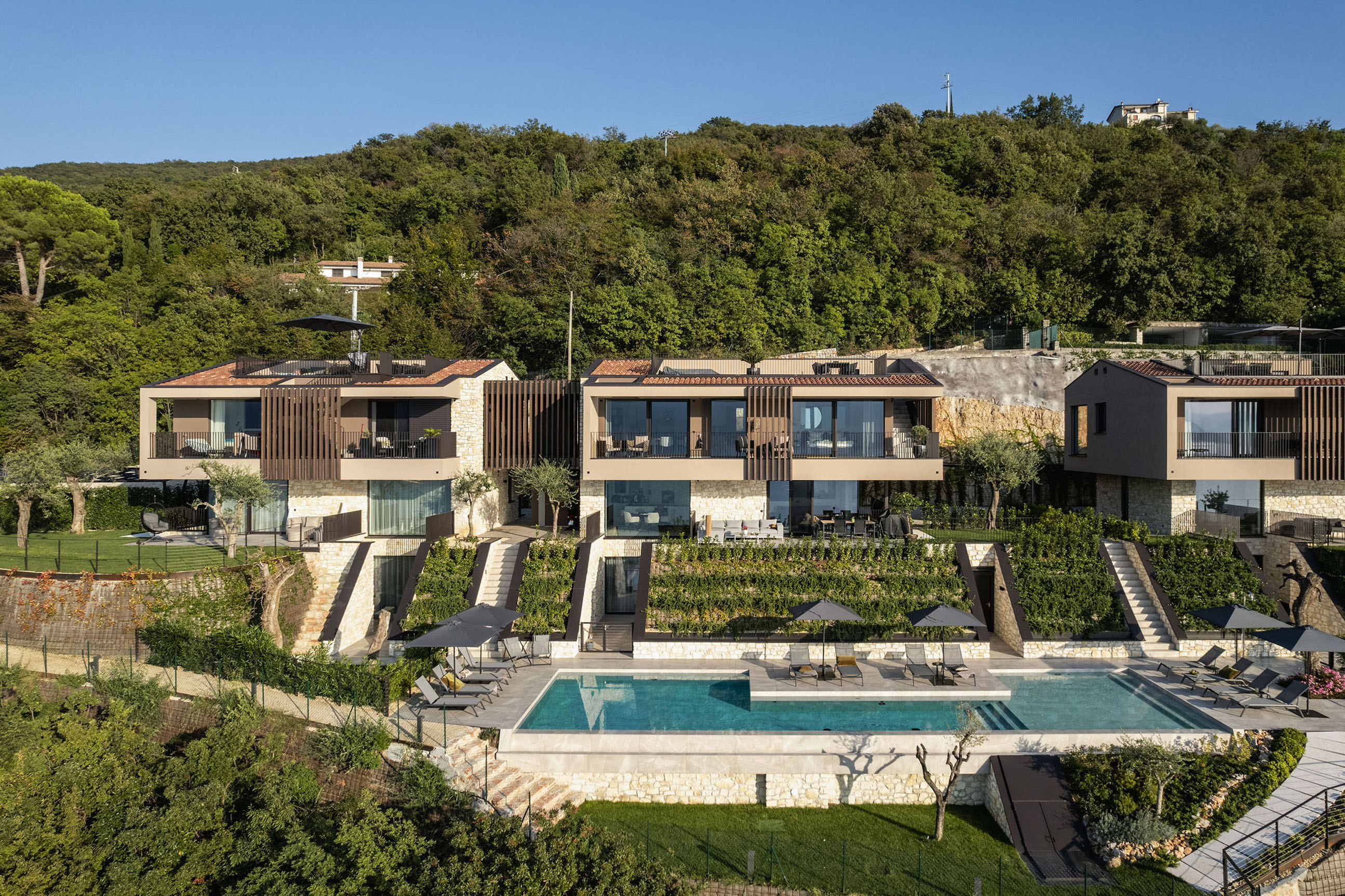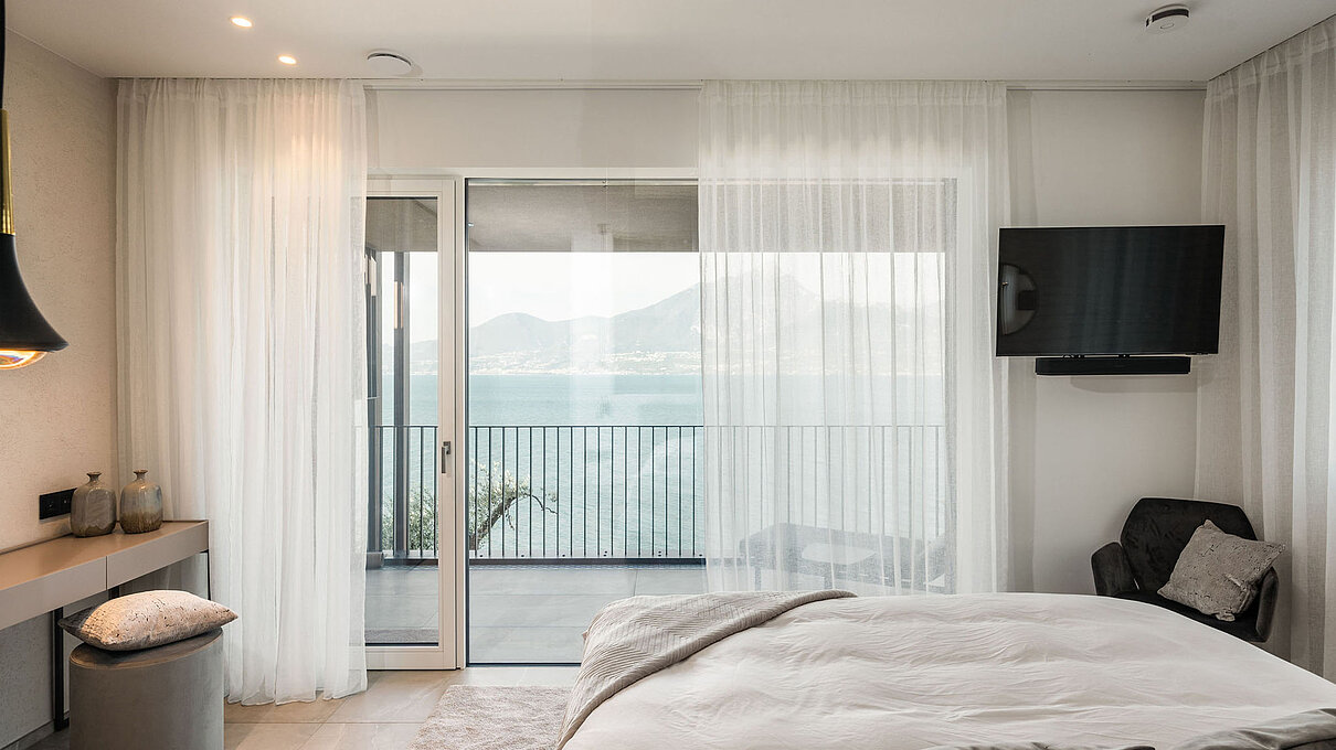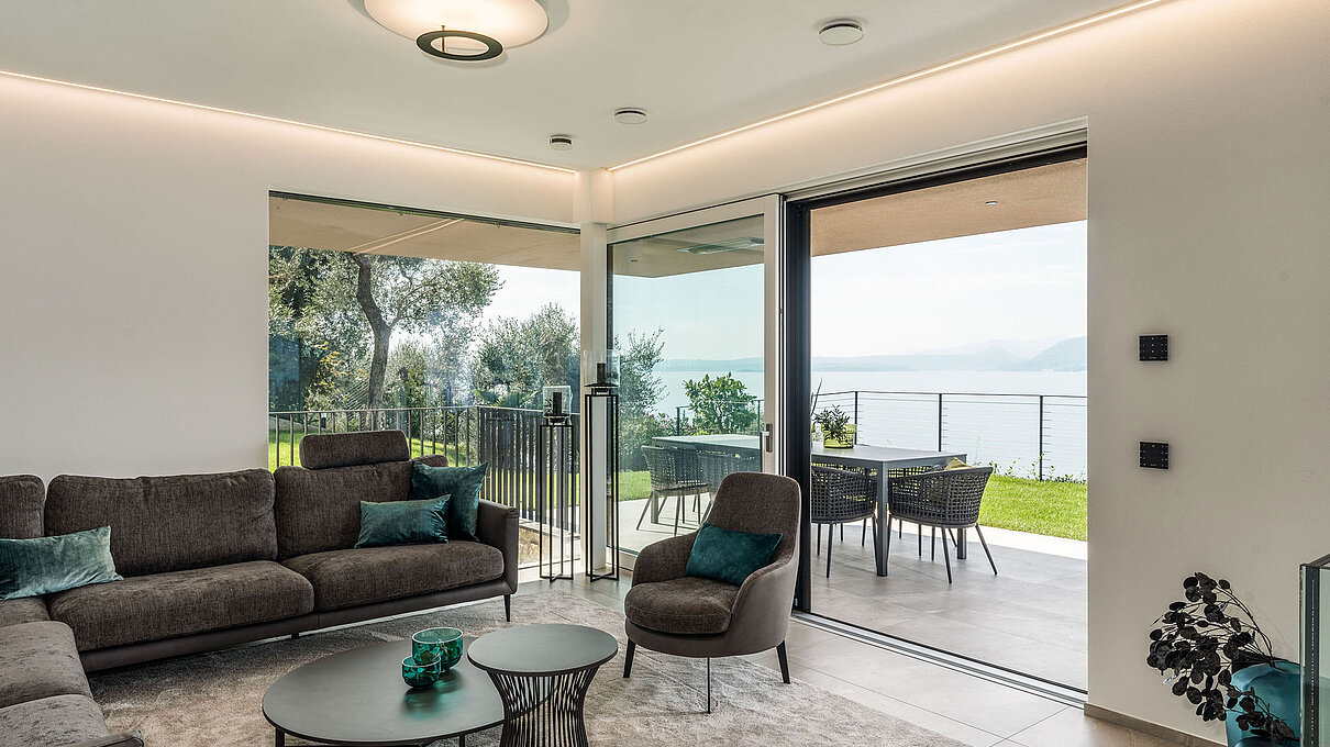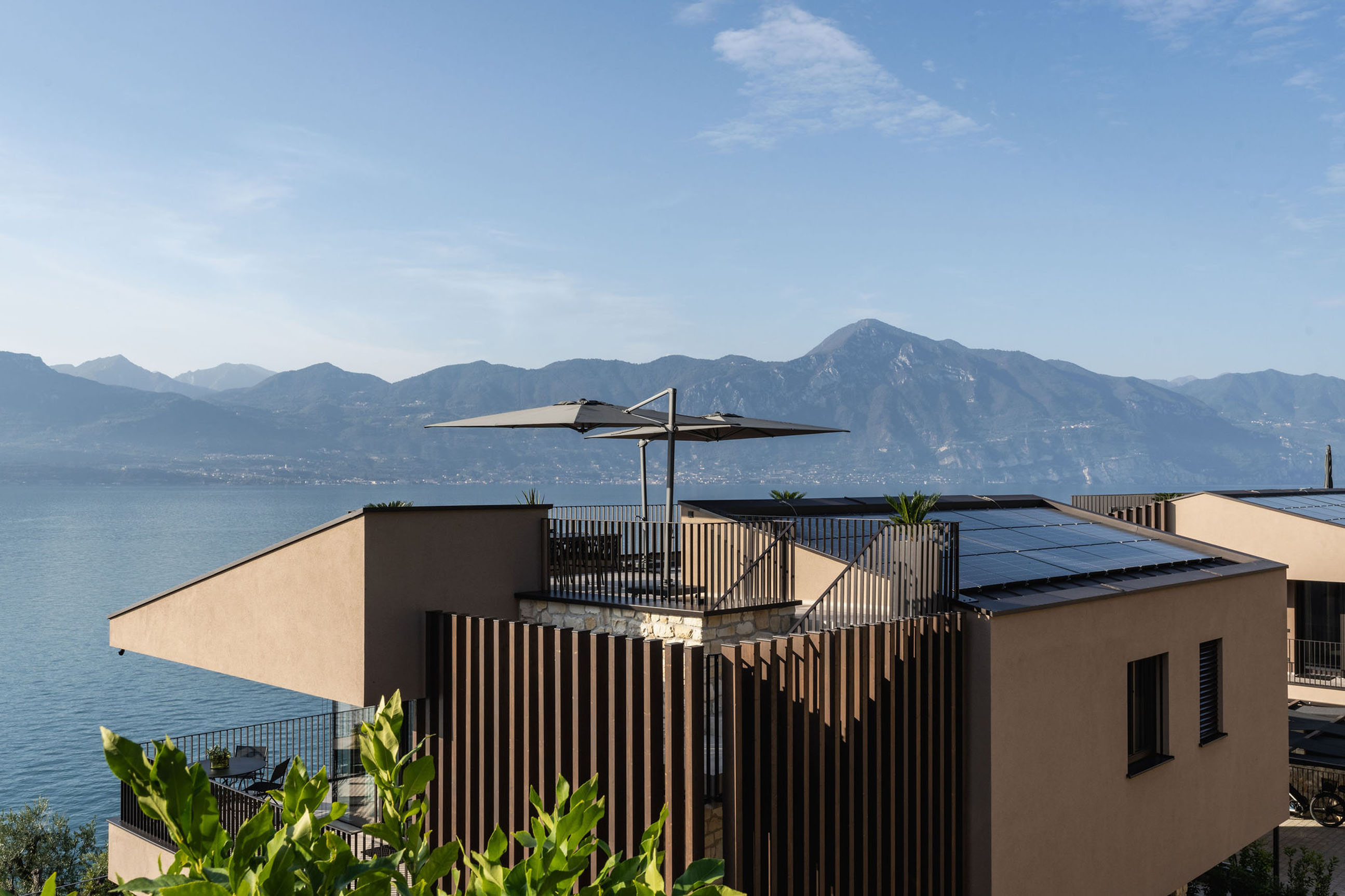 Entlang des Sees, etwas oberhalb von Torri del Benaco, am Hang der Gardesana, erstrecken sich drei elegante Baukörper bestehend aus sechs Einheiten. Der atemberaubende Ausblick auf das Hafenstädtchen und die Weiten des Sees machen den Aufenthalt zu einem Erlebnis der besonderen Art.
