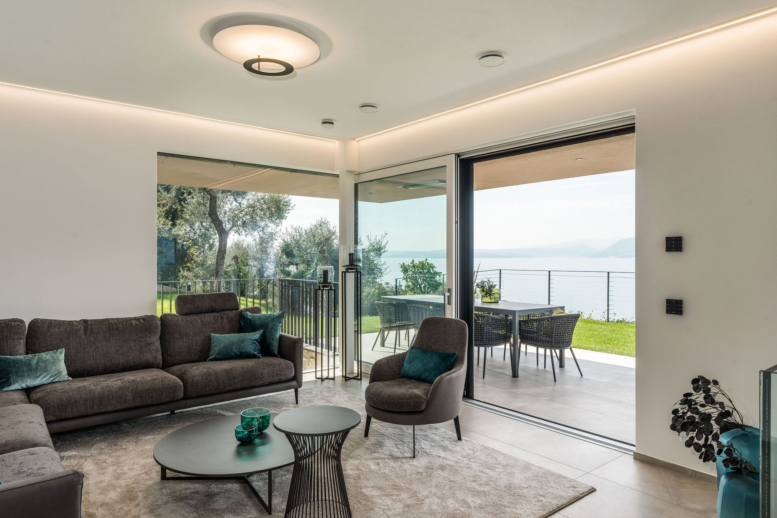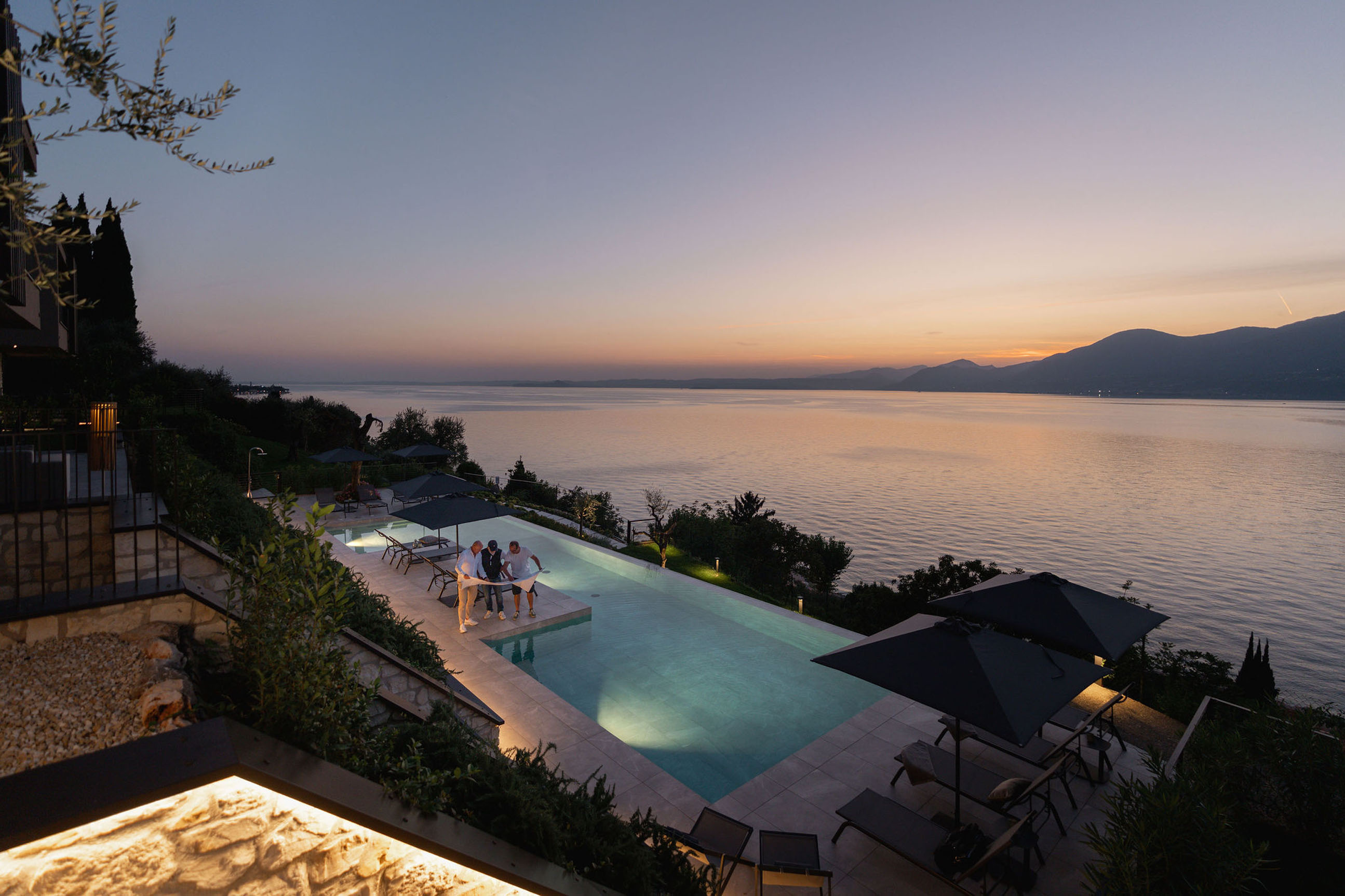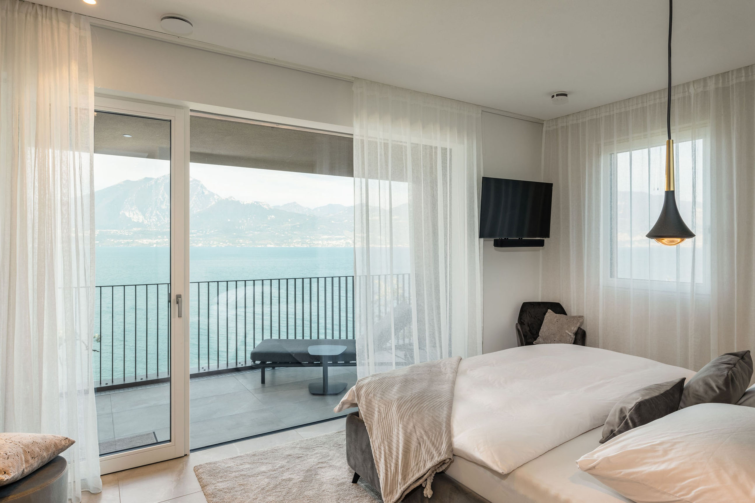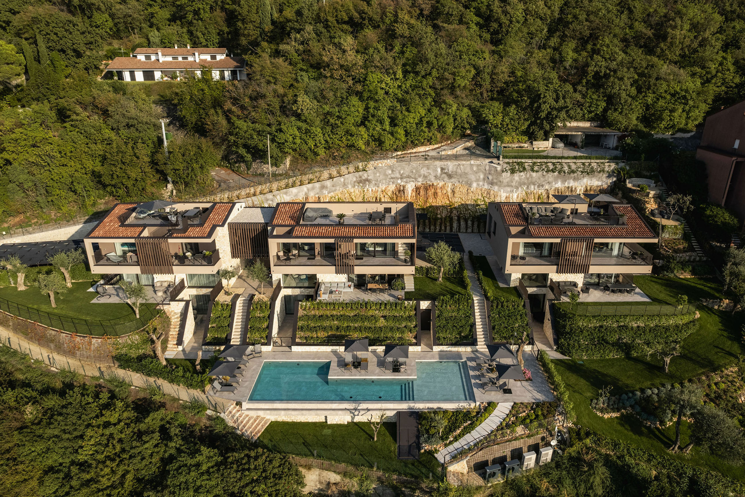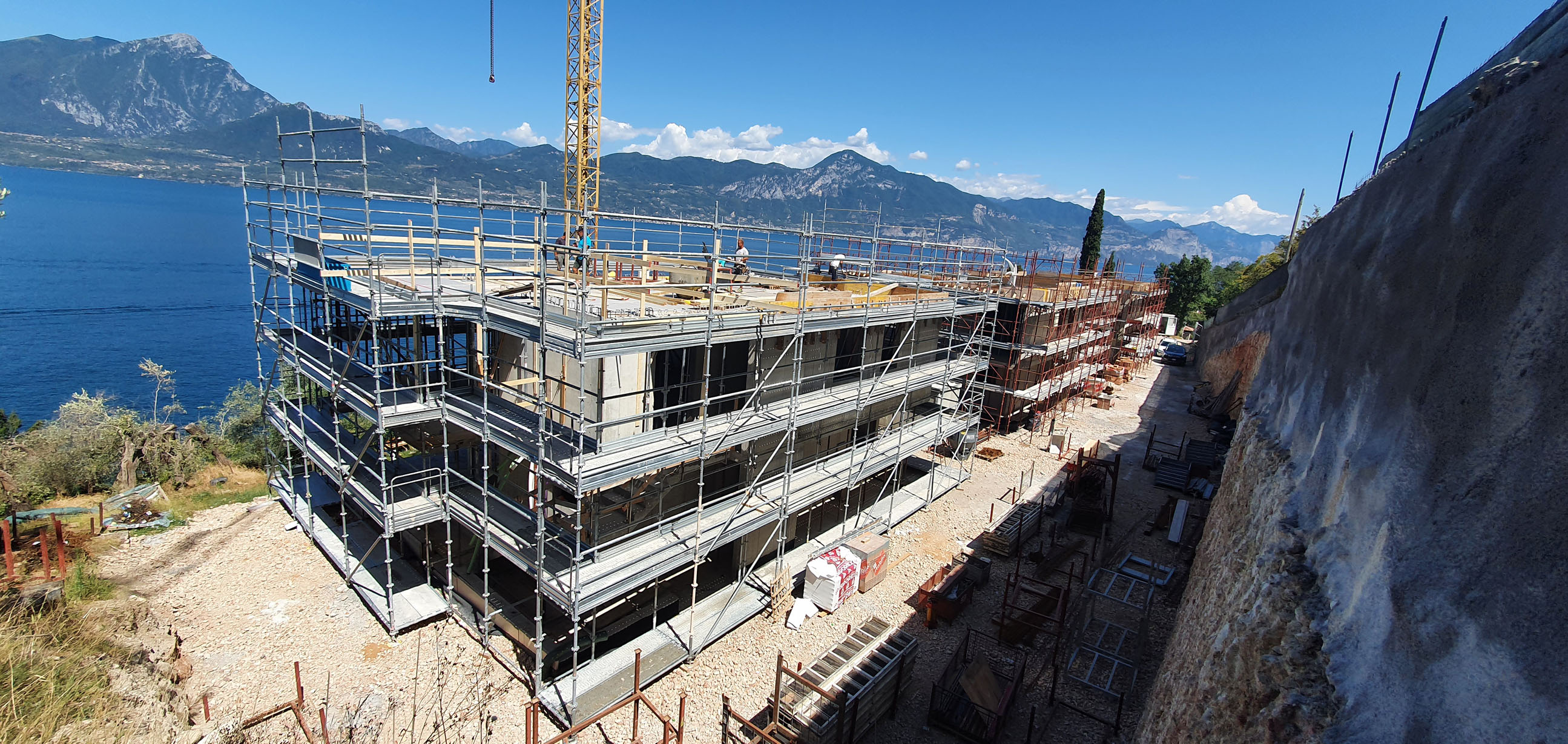 Entlang des Sees, etwas oberhalb von Torri del Benaco, am Hang der Gardesana, erstrecken sich drei elegante Baukörper bestehend aus sechs Einheiten. Der atemberaubende Ausblick auf das Hafenstädtchen und die Weiten des Sees machen den Aufenthalt zu einem Erlebnis der besonderen Art.